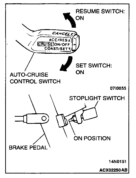 1. Turn the ignition switch to the "ON" position while holding the auto-cruise control switch in the "SET" (down) position. Then, within one second, more the auto-cruise control switch up to the "RES" position.