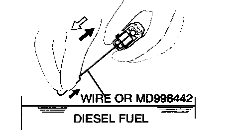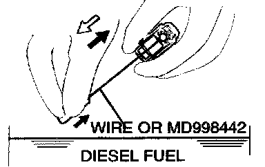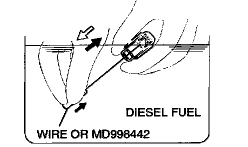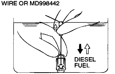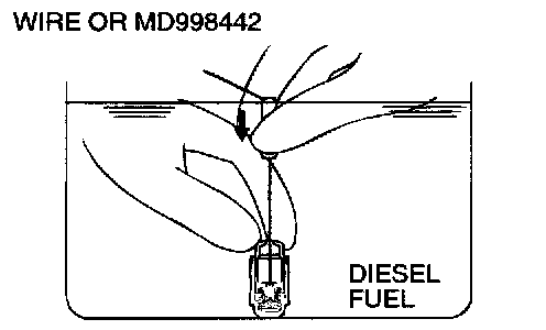 3. While gently pushing down the internal steel ball using wire [0.5 mm (0.020 inch) in diameter] or special tool MD998442, move the plunger through Eve to ten strokes until it slides smoothly. In addition to eliminating stiffness in the plunger, this operation will remove dirty oil.