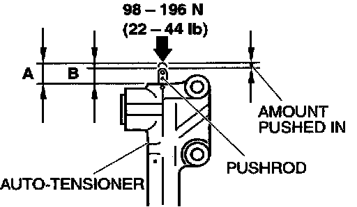 1. Apply 98 - 196 N (22 - 44 pound) force to the pushrod of the auto-tensioner by pressing it against a metal object (such as the engine block) and measure the movement of the pushrod.