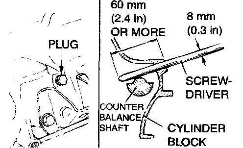 2. After aligning the timing mark on the oil pump sprocket, remove the cylinder block plug and insert a Phillips) head 8 mm (0.3 inch) screwdriver. Check to be sure that the screwdriver goes in 60 mm (2.4 inches) or more. If the screwdriver will only go in 20 - 25 mm (0.8 - 1.0 inch) before striking the counterbalance shaft, turn the sprocket once, realign the timing marks and check that the screwdriver goes in 60 mm (2.4 inches) or more. The screwdriver should not be taken out until the timing belt is installed.