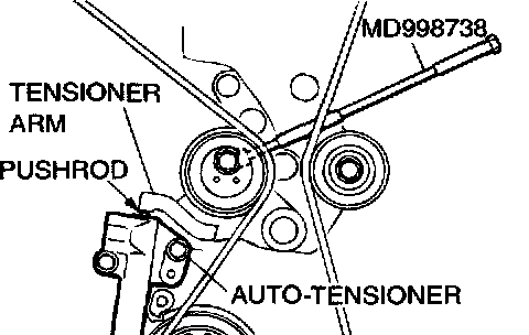 1. Remove the rubber plug from the rear of the timing belt cover assembly. Then screw in special tool MD998738 by hand until the tensioner arm is touching the auto-tensioner pushrod.