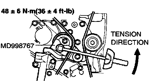 3. Loosen the tension pulley fixing bolt, and then use special tool MD998767 and a torque wrench to tighten the fixing bolt to the specified torque while applying tension to the timing belt.