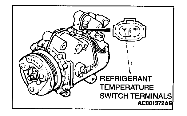 When the A/C is off, check that there is less than 2 Ohms between the refrigerant-temperature switch terminals.