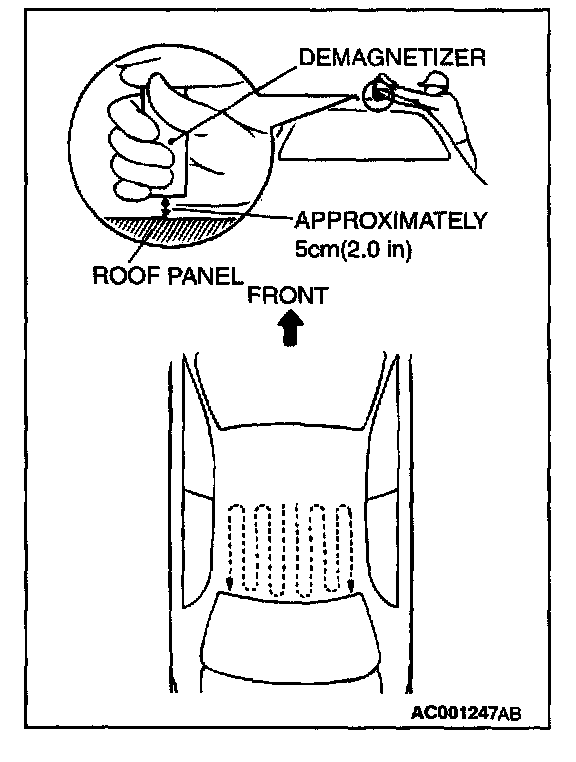 CAUTION: If the tip of demagnetizer touches the roof panel, the magnetizing condition of body becomes worse to the contrary. Absolutely avoid this.