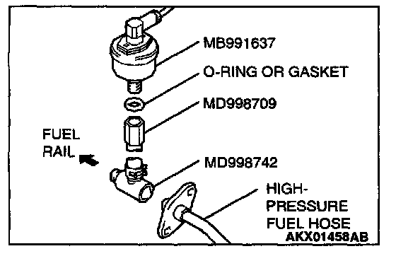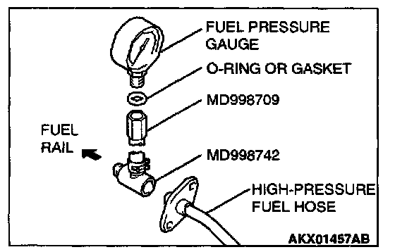 2. Place a suitable O-ring or gasket on assembled special tools MD998709 and MD998742 and install the fuel pressure gauge.