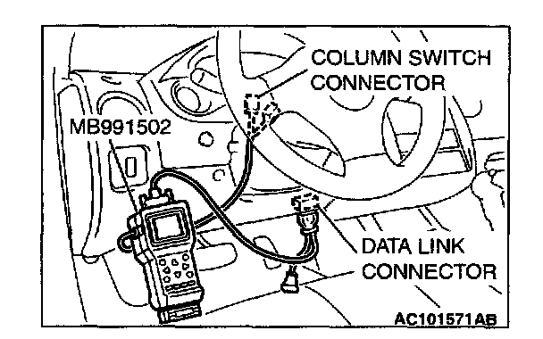 CAUTION: To prevent damage to scan tool MB991502, always turn the ignition switch to the "LOCK" (OFF) position before connecting or disconnecting scan tool MB991502. Also connect SWS monitor kit MB991862 after turning on scan tool MB991502.