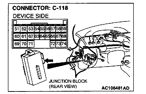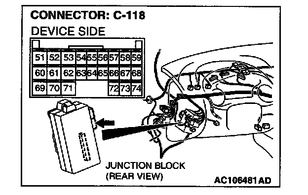 STEP 8. Check the front-ECU connector A-11X and ETACS-ECU connector C-118 for damage.