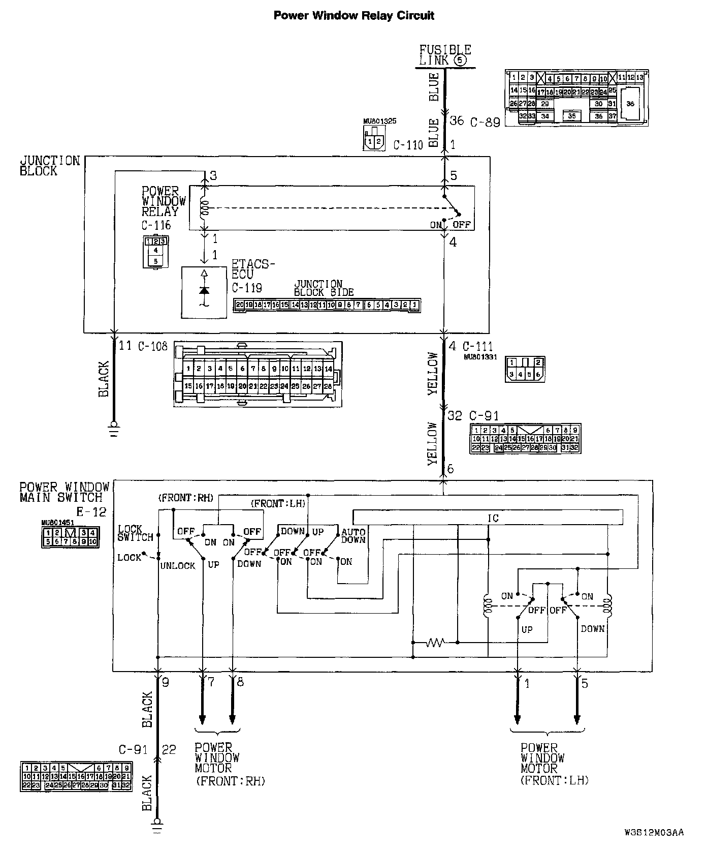 The ETACS-ECU turns on the power window relay (installed on the junction block) to activate the power windows when the ignition switch (IG1) is turned to the "ON" position.