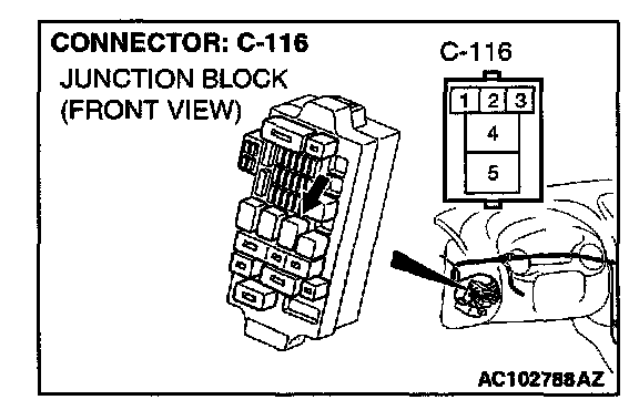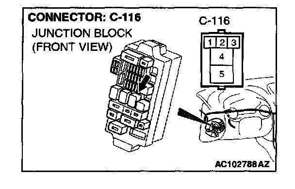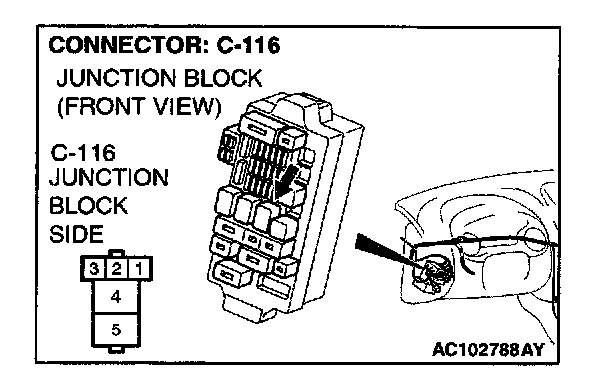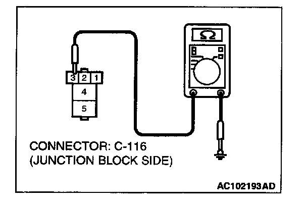 1. Disconnect power window relay connector C-116, and measure at the junction block side.