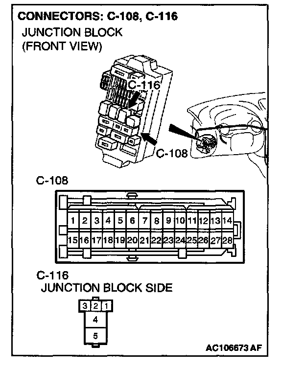 NOTE: Also check junction block connector C-108. If junction block connector C-108 is damaged, repair or replace the connector as described in Harness Connector Inspection.