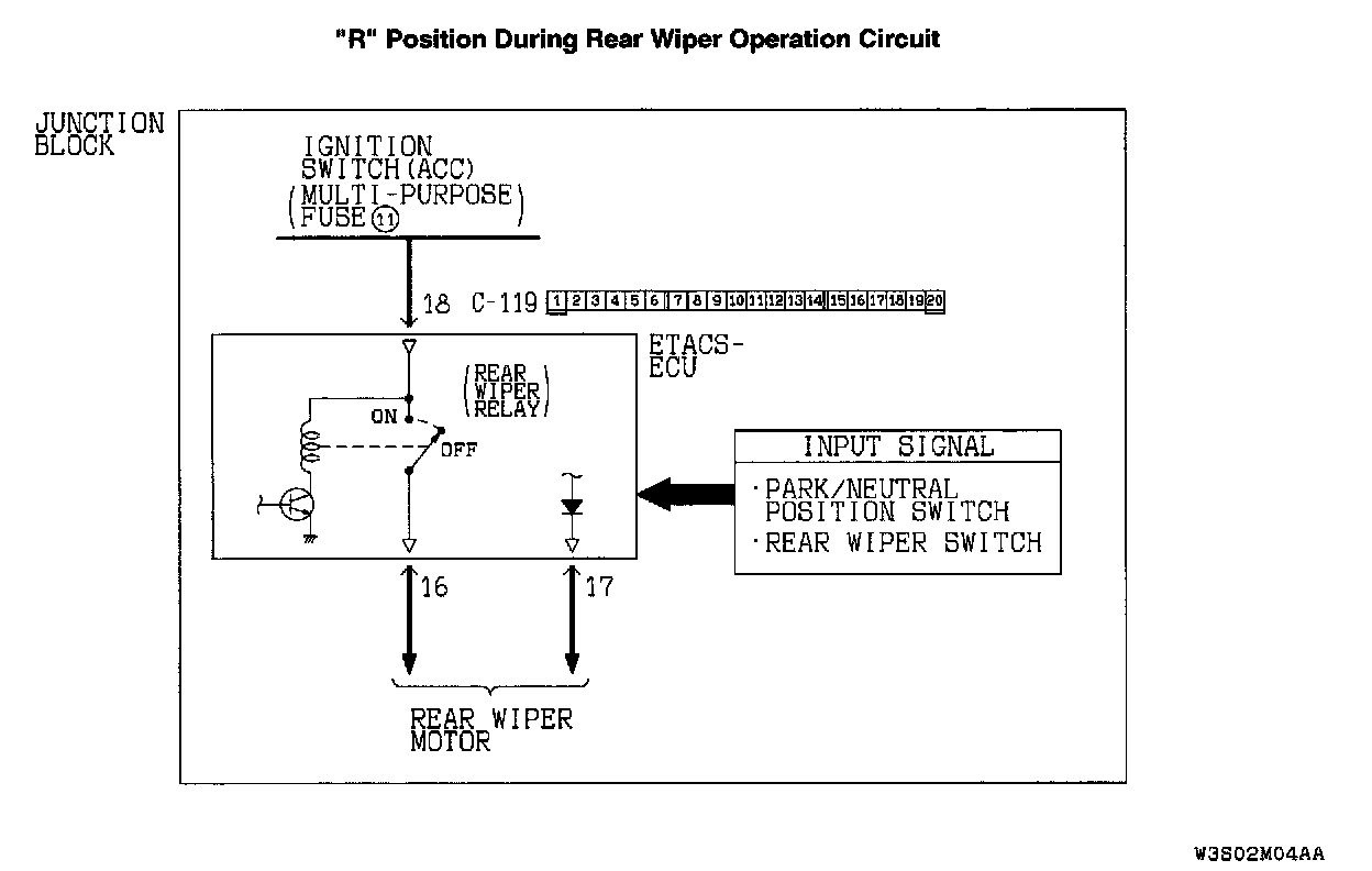 If the rear wiper does not work consecutively approximately twice, the park/neutral position switch ("R" position) or the ETACS-ECU may be defective.