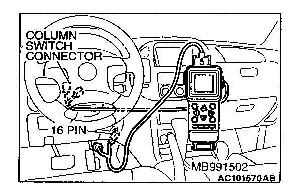 CAUTION: To prevent damage to scan tool MB991502, always turn the ignition switch to the "LOCK" (OFF) position before connecting or disconnecting scan tool MB991502. Also connect SWS monitor kit MB991862 after turning on scan tool MB991502.