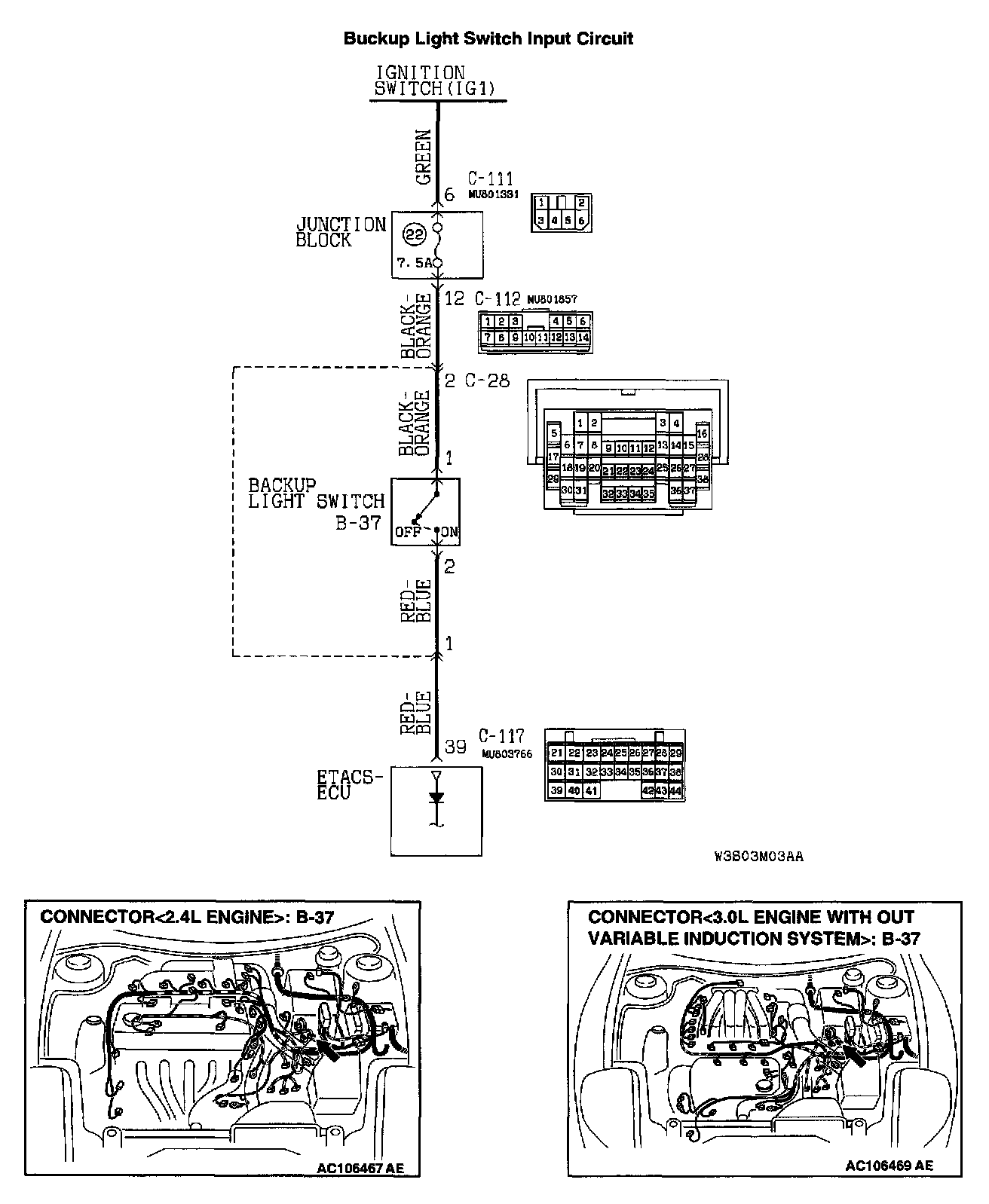 Q: Are backup light switch connector B-37 and ETACS-ECU connector C-117 in good condition?