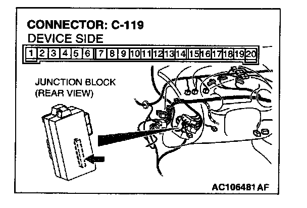 STEP 6. Check rear wiper motor connector F-07 and ETACS-ECU connector C-119 for damage.