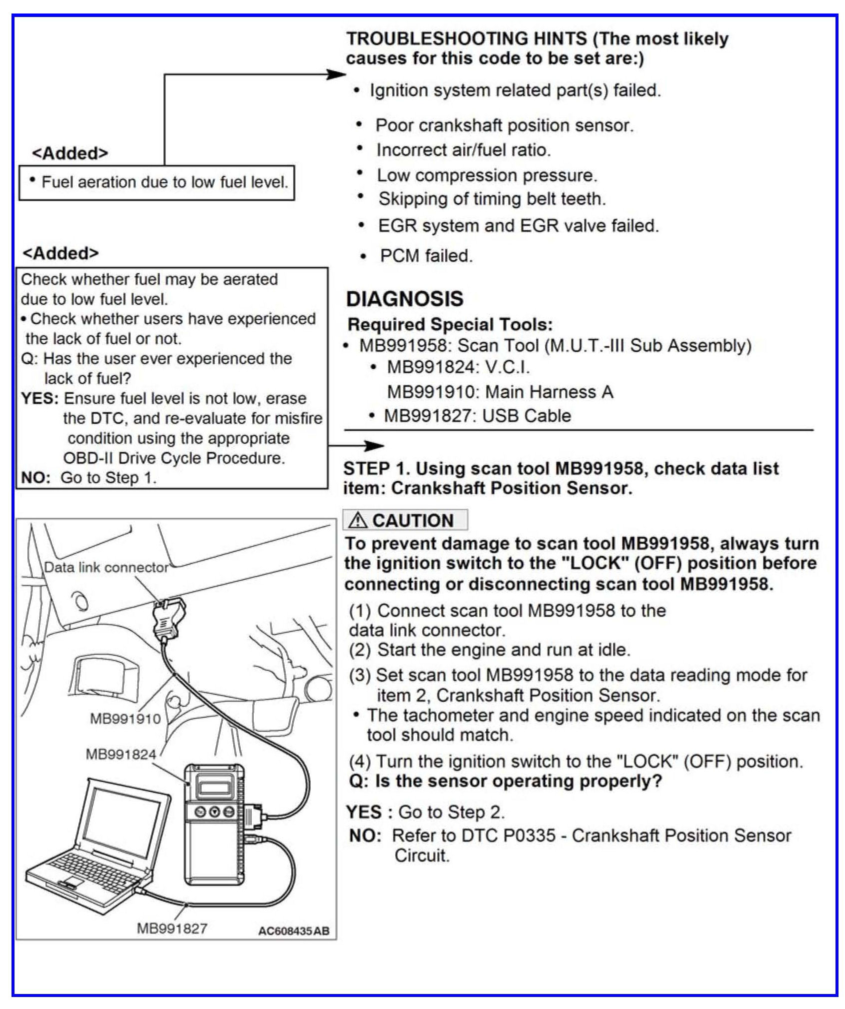 The misfire DTCs listed below can be set due to fuel aeration caused by low fuel level. This possible cause has been added to the diagnosis procedures for these DTCs.