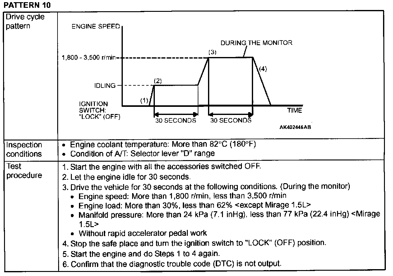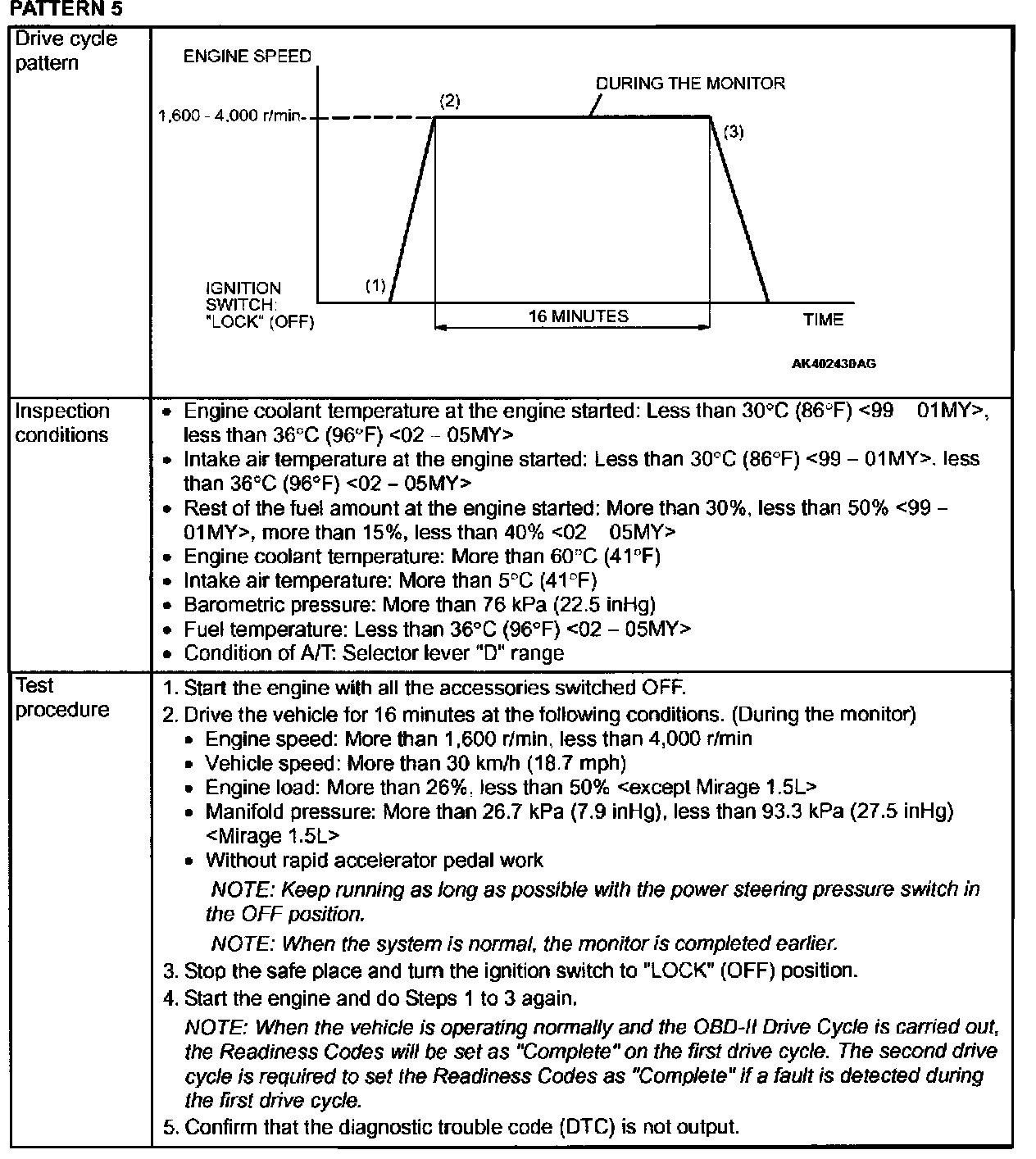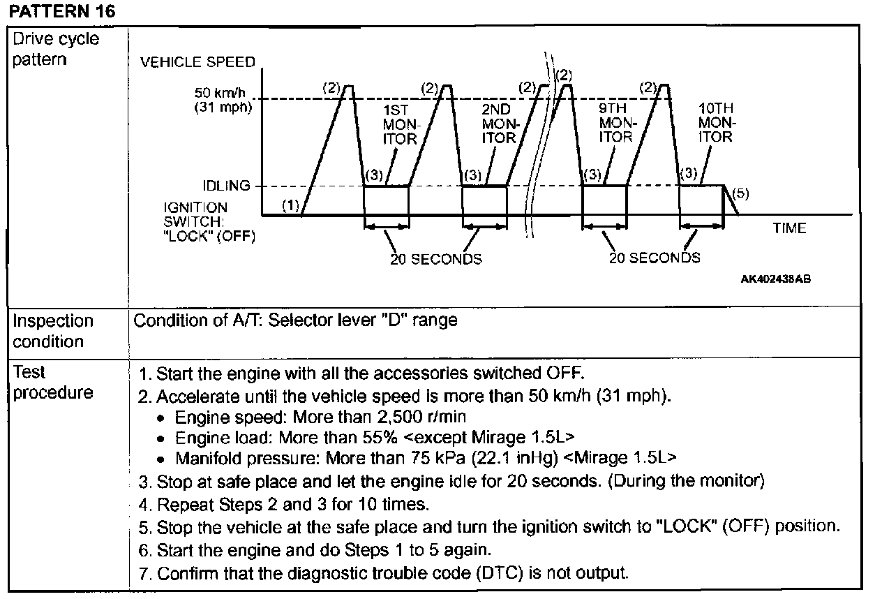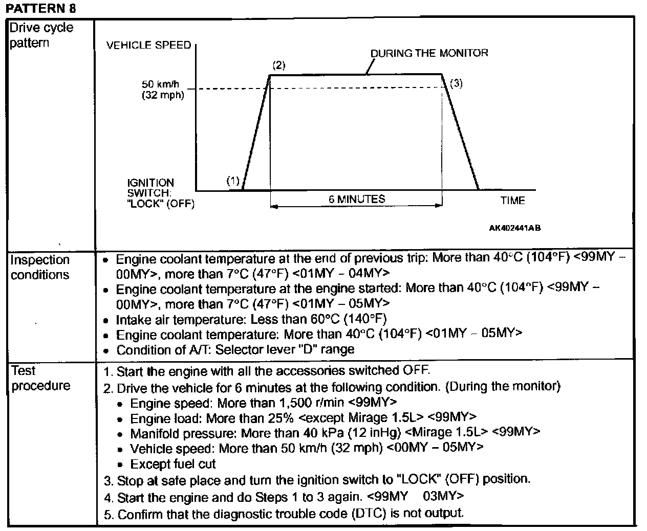 Drive cycle patterns are not established for Vehicle speed sensor monitor (DTC P0500) Closed throttle position switch monitor (DTC P0510). Power steering pressure switch monitor (P0551). Please reference the MUT data list to judge whether these monitor items are normal.