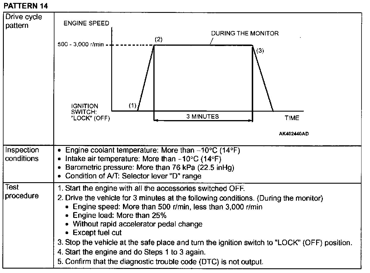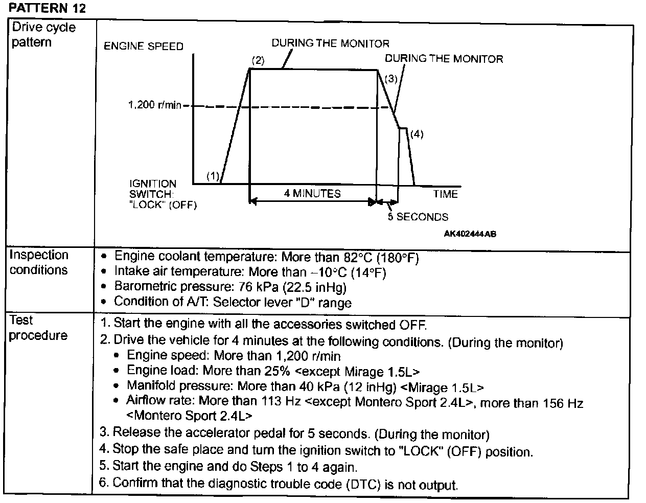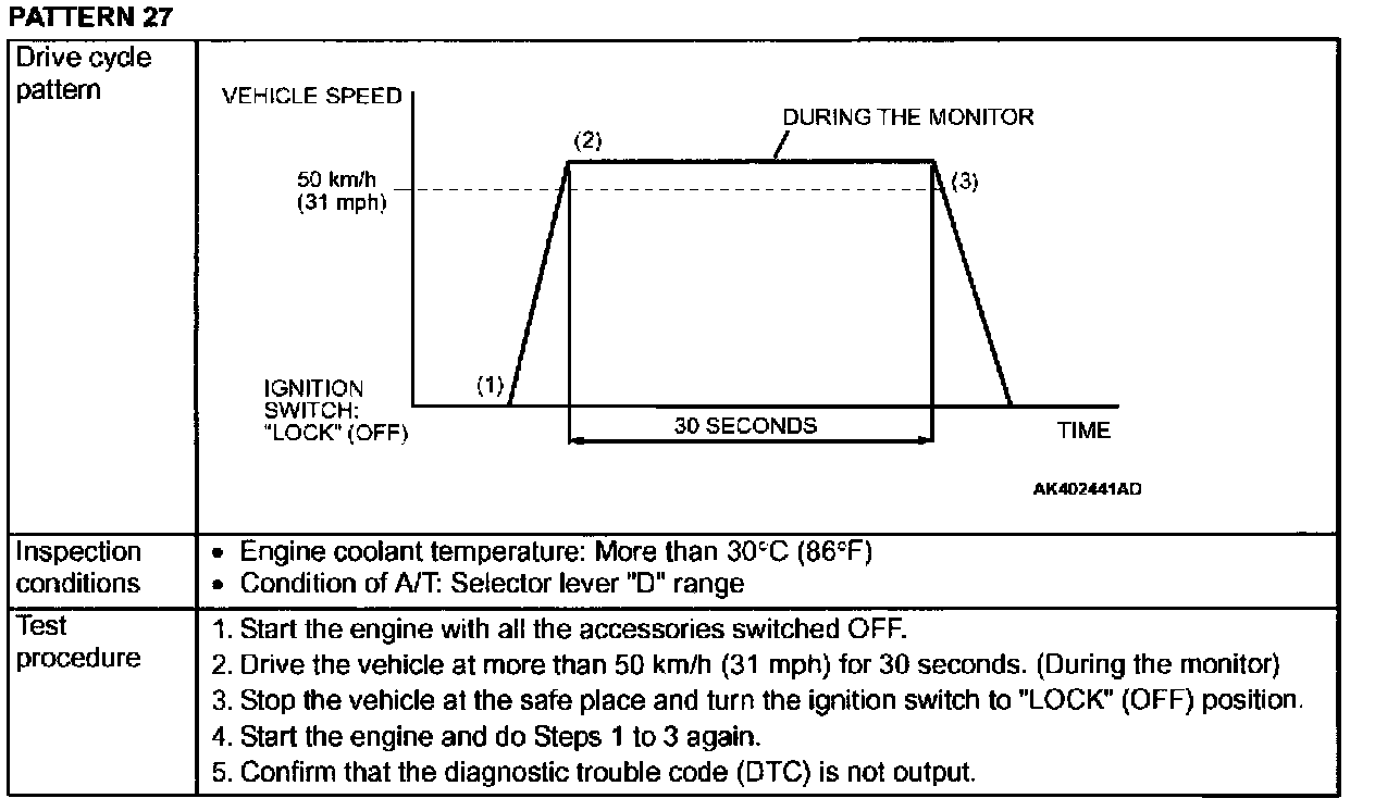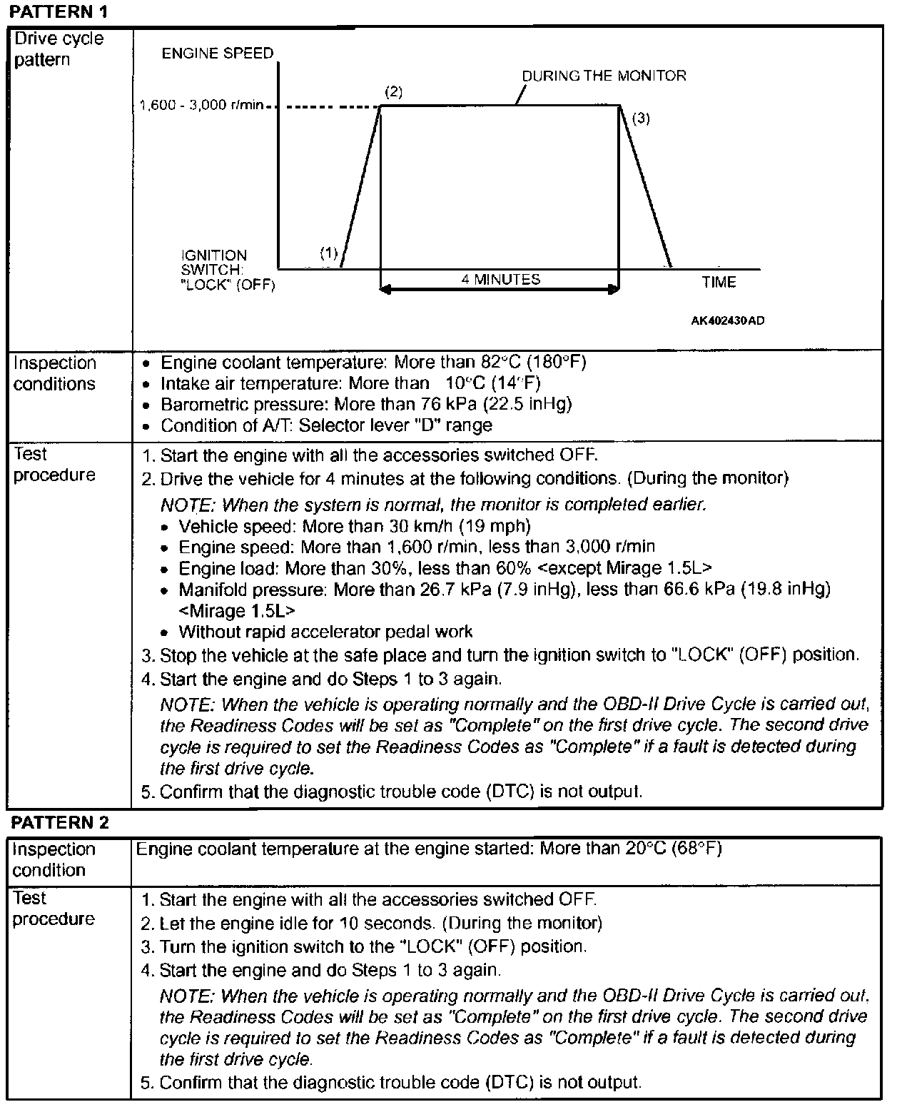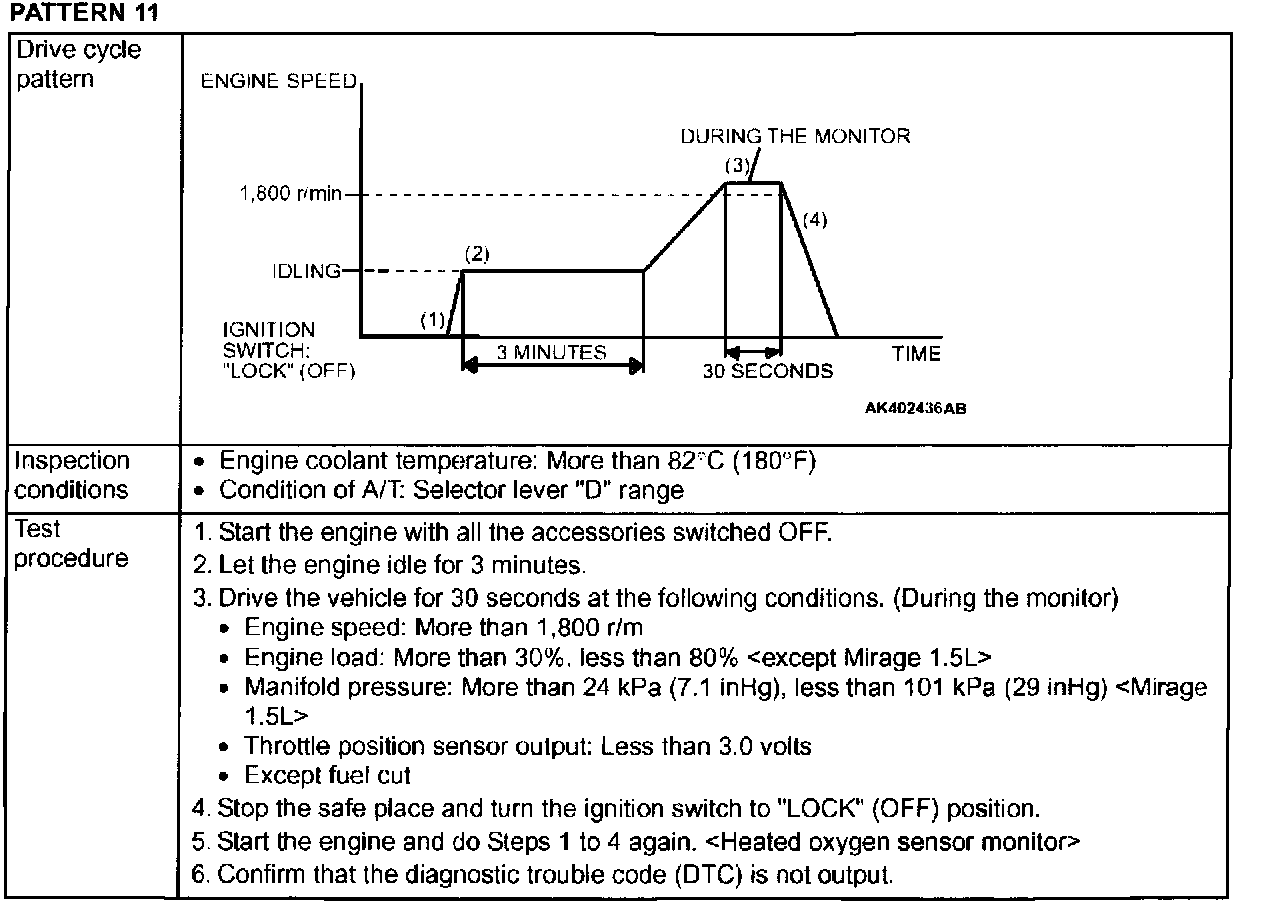 Drive cycle patterns are not established for Vehicle speed sensor monitor (DTC P0500) Closed throttle position switch monitor (DTC P0510). Power steering pressure switch monitor (P0551). Please reference the MUT data list to judge whether these monitor items are normal.
