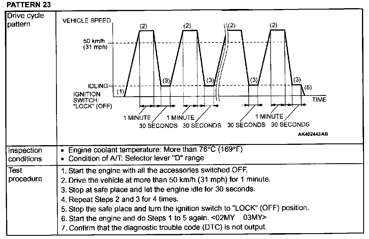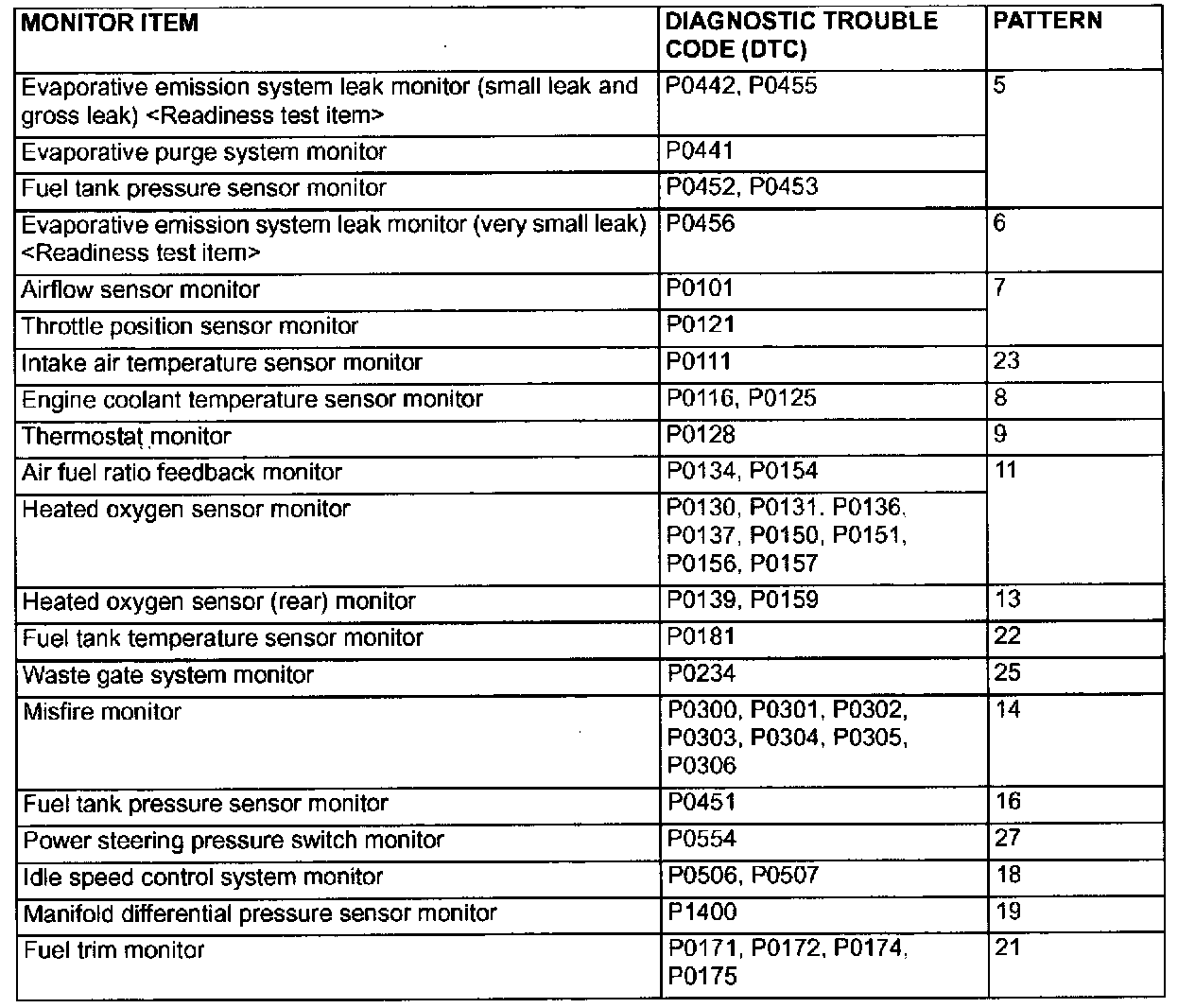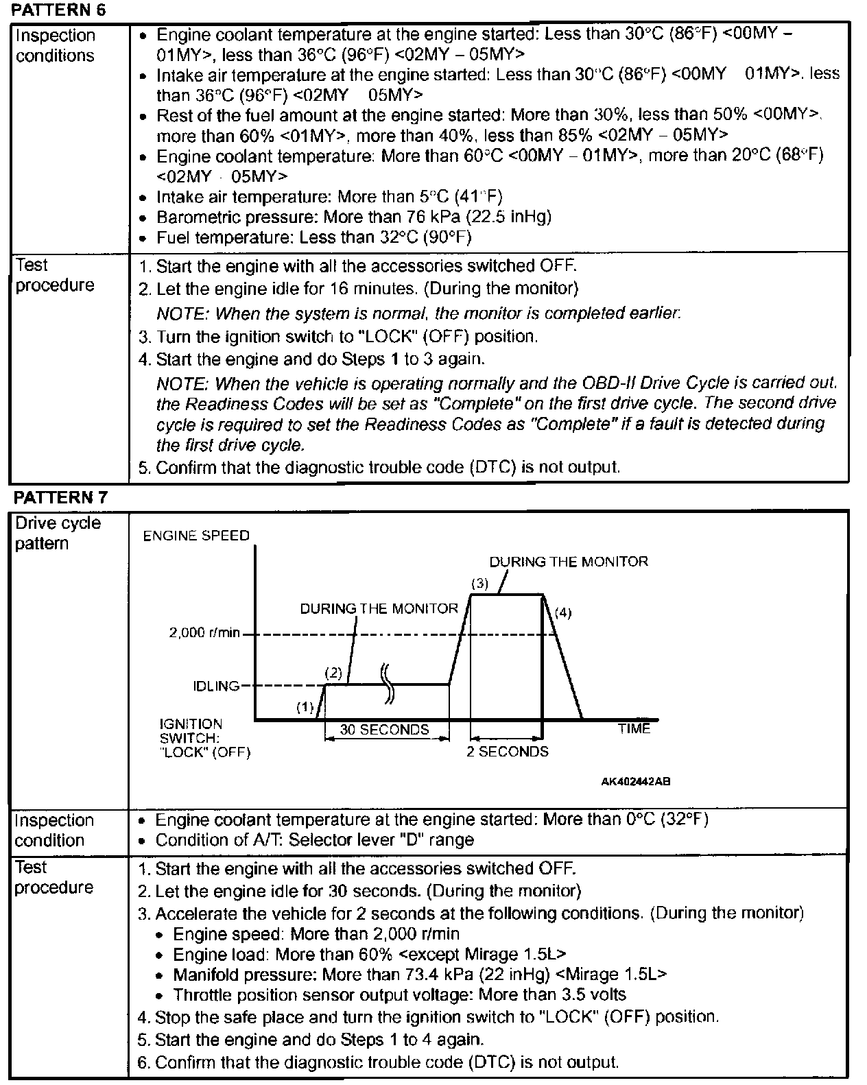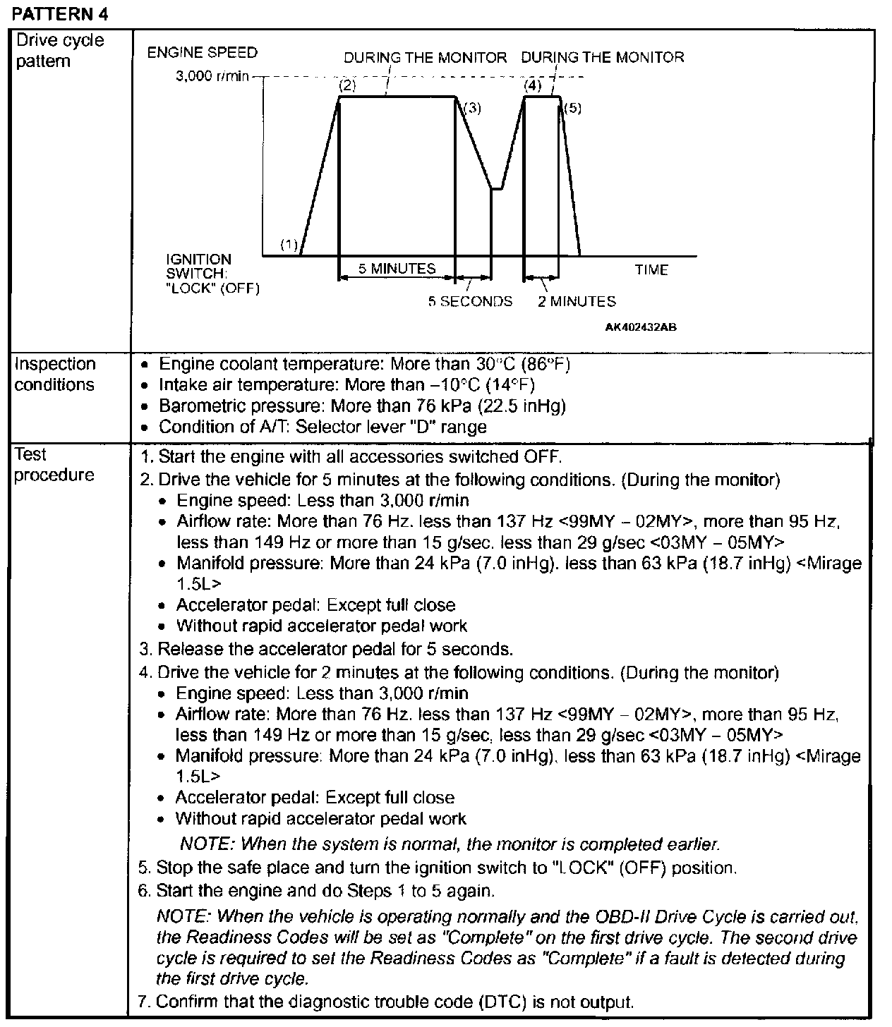 Drive cycle patterns are not established for Vehicle speed sensor monitor (DTC P0500) Closed throttle position switch monitor (DTC P0510). Power steering pressure switch monitor (P0551). Please reference the MUT data list to judge whether these monitor items are normal.