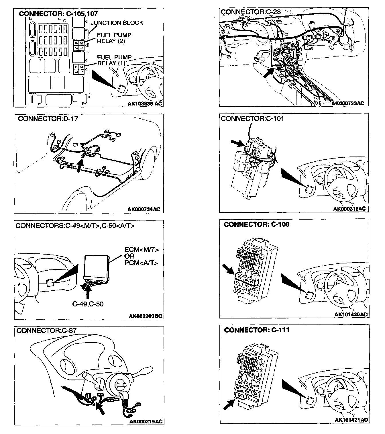 STEP 2. Check connector C-107 at fuel pump relay 1 and connector C-105 at fuel pump relay 2 for damage.