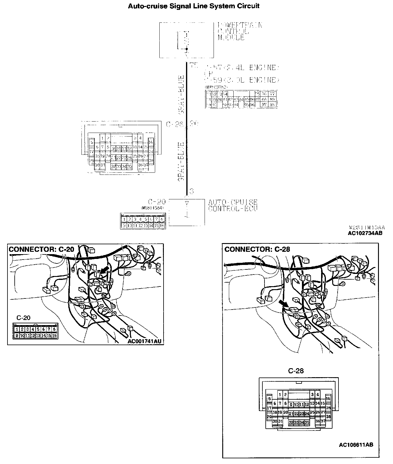 STEP 6. Check harness for short circuit to ground, open circuit or damage between PCM connector C-57 <2.4L Engine> or C-59 <3.0L Engine> terminal 75 and auto-cruise control-ECU connector C-20 terminal 3.