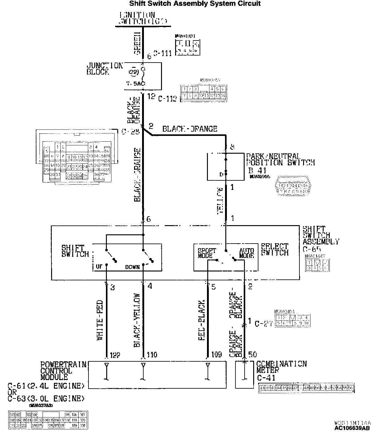 If the select switch of the shift switch assembly is set to the sport mode, battery positive voltage will be applied to the PCM (terminal number 109). If the shift switch of the shift switch assembly is set to "UP" or "DOWN" position, battery positive voltage will be applied to the PCM (terminal number 122, 110).
