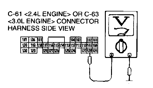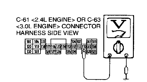 STEP 12. Check the switch output voltage at PCM connector C-61 <2.4L Engine> or C-63 <3.0L Engine> by backprobing.