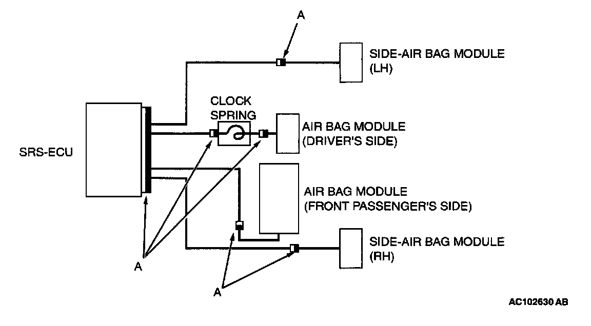 To enhance the system reliability, a connector lock switch is integrated in the SRS-ECU connector, the air bag module connectors and the clock spring connector (black connector "A" shown in the illustration).