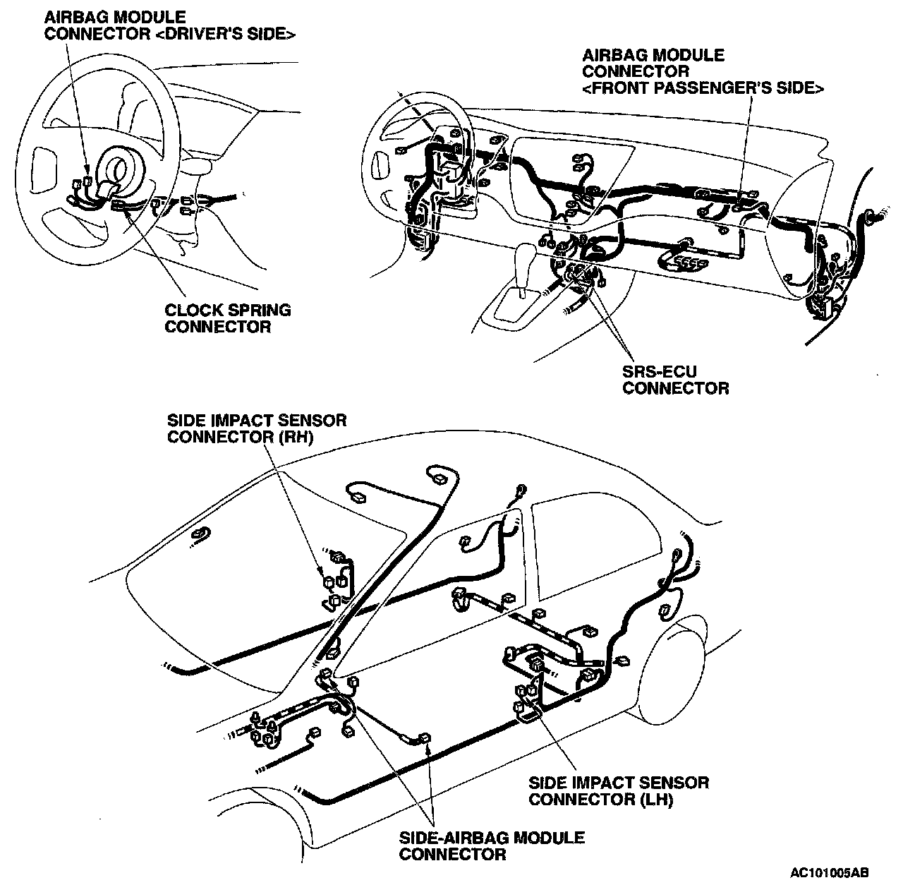 2. Check the harness for binds, the connectors for damage, and the terminals for deformation. REPLACE ANY CONNECTOR OR HARNESS THAT FAILS THE VISUAL INSPECTION. (Refer to SRS Service Precaution.)