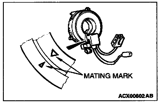WARNING: If the clock spring's mating mark is not properly aligned, the steering wheel may not completely rotate during a turn, or the flat cable within the clock spring may be severed, obstructing normal operation of the SRS and possibly leading to serious injury to the vehicle's driver and front passenger.