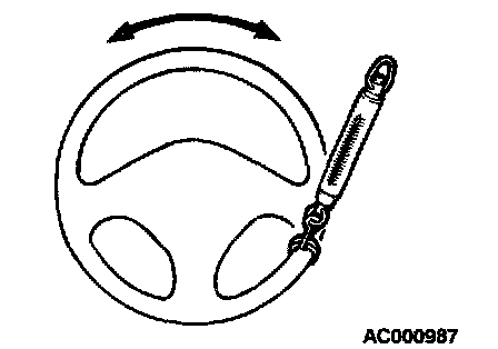 3. Attach a spring scale to the outer circumference of the steering wheel and measure the steering force required to turn the steering wheel from the straight ahead position to the left and right (within a range of 1.5 turns). Also check to be sure that there is no significant change in the required steering effort.