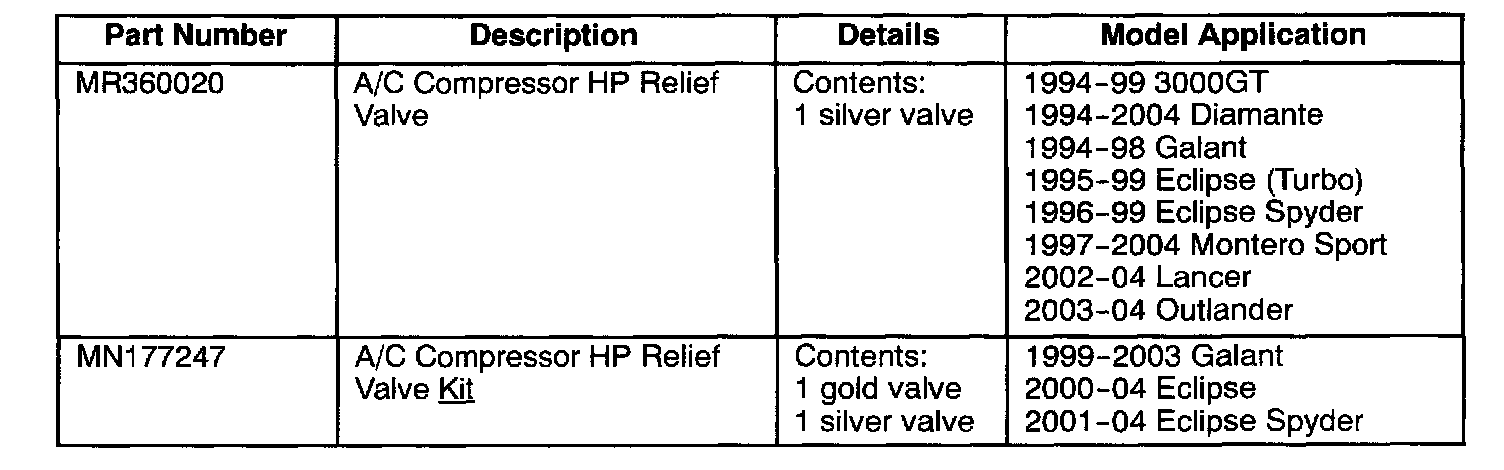 There are two different types of high-pressure relief valves used for 1999-2003 Galant, 2000-04 Eclipse, and 2001-04 Eclipse Spyder The relief valve will be either gold or silver One relief valve of each color will be included in service part kit MN177247 When replacing the valve, the dealer technician must confirm the color of the valve on the vehicle and then select the same colored valve from the kit.