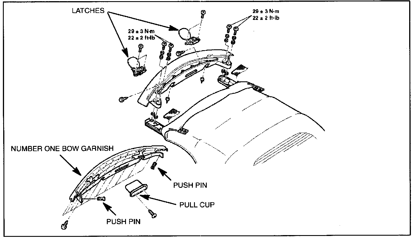 d. Open the convertible top to the half-open (vertical) position. Lock the latches. Then remove the number one bow garnish.