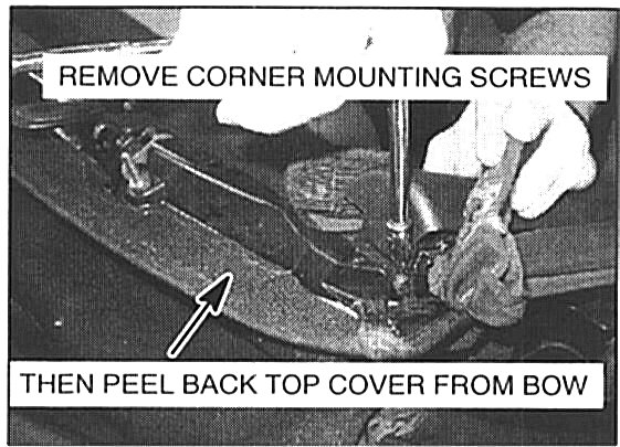 d. Reassemble the conventible top, installing components in reverse order of removal. To ensure smooth cover installation, align the screw holes in the edge of the lop cover to the screw holes in the number one bow. If additional adhesive is required, use a small amount of weatherstrip adhesive p/n A990ZC1X03.