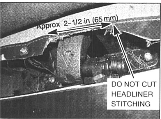 a. Use tin snips or a knife to cut a notch in the headliner of approximately 2-1/2" (65 mm) length as shown. Cut through two layers (the headliner material layer and a plastic layer).