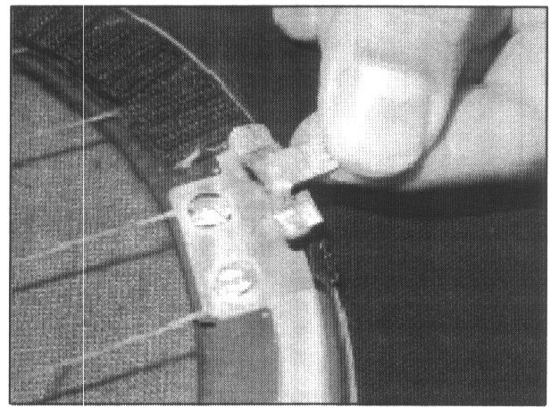 6. Place the tab onto the adhesive. DO NOT ATTACH THE DEFOGGER WIRE AT THIS TIME. THE ADHESIVE MUST CURE FIRST. Position the terminal so the connector tab points away from the grid (toward the outside edge of the glass).