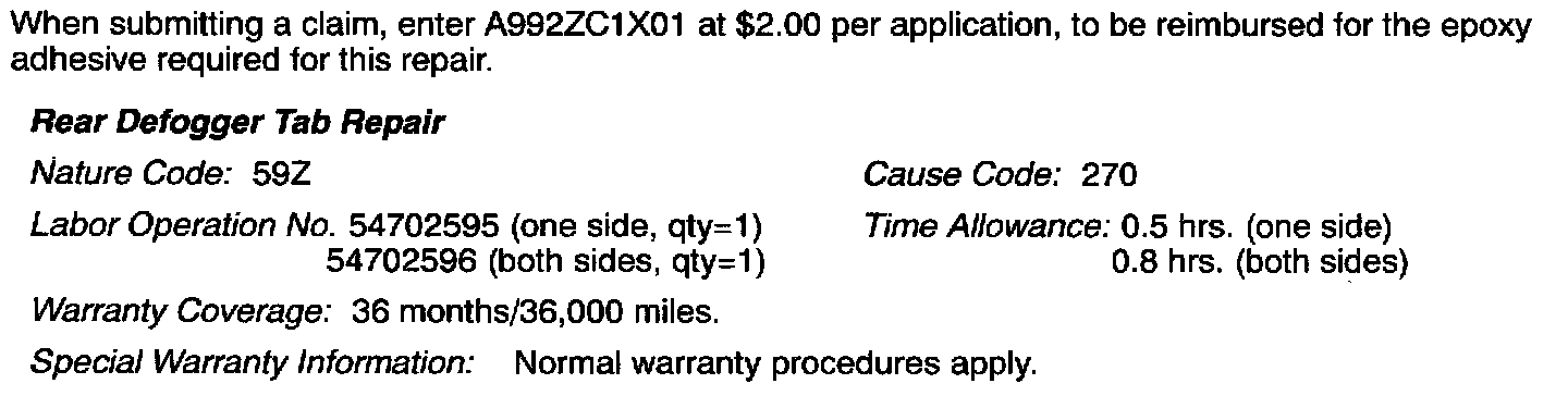 This bulletin contains instructions for reattaching rear window defogger tabs which may have detached from the rear glass.