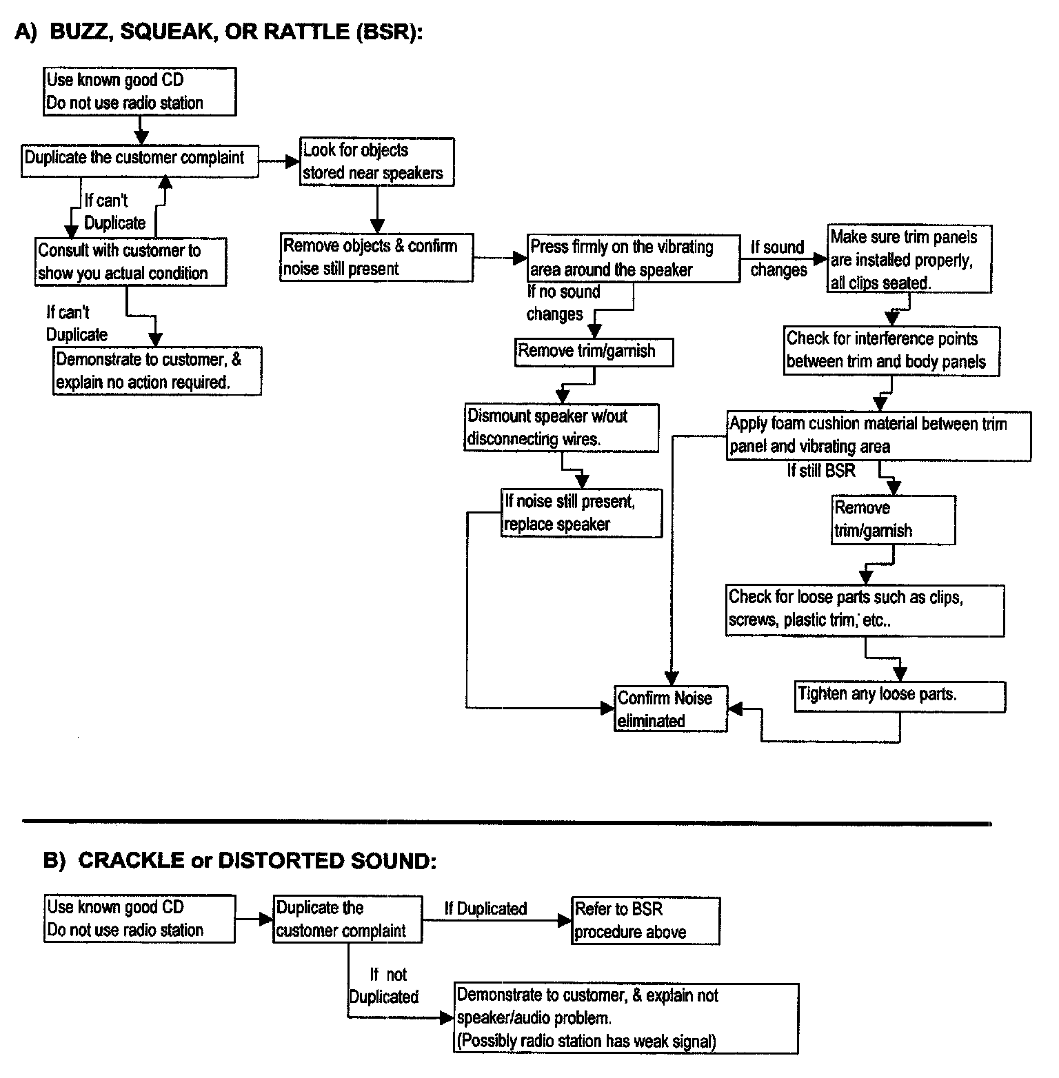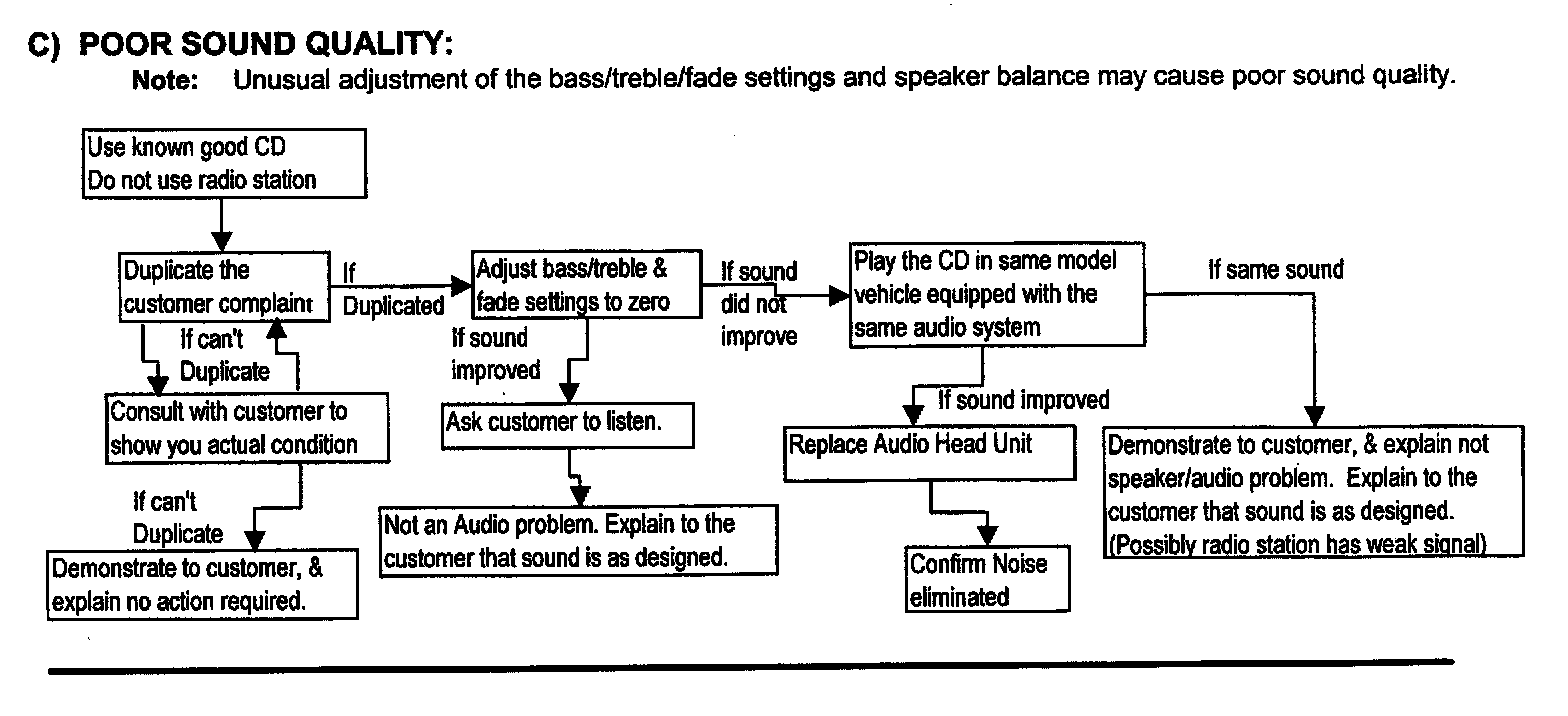 Proper diagnosis of speaker or speaker related conditions is important for customer satisfaction and correct warranty reporting. Some of these reported abnormal sounds, which are often attributed to the speakers, may have other origins. Speakers are often replaced without the actual problem being solved. In some cases, supposedly faulty speakers returned for warranty have been checked by the speaker manufacturer with no problem found. Make sure the suspected speaker is carefully evaluated before replacement. Use the troubleshooting procedures represented in the three flowcharts in this bulletin to help diagnosis speaker related conditions.