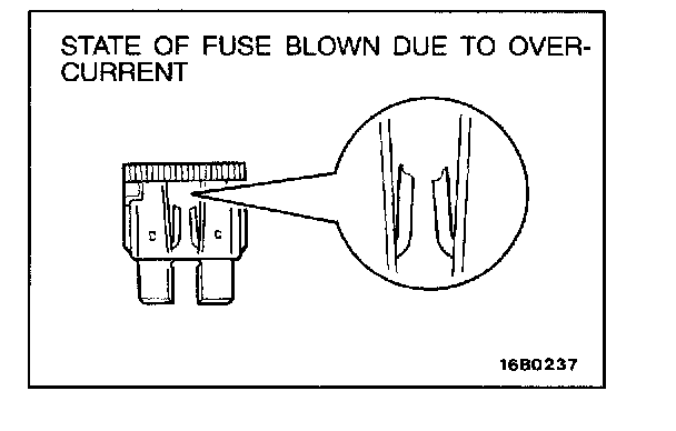 When a fuse is blown, there are two probable causes as follows: One is that it is blown due to flow of current exceeding its rating. The other is that it is blown due to repeated on/off current flowing through it. Which of the two causes is responsible can be easily determined by visual check as described below.