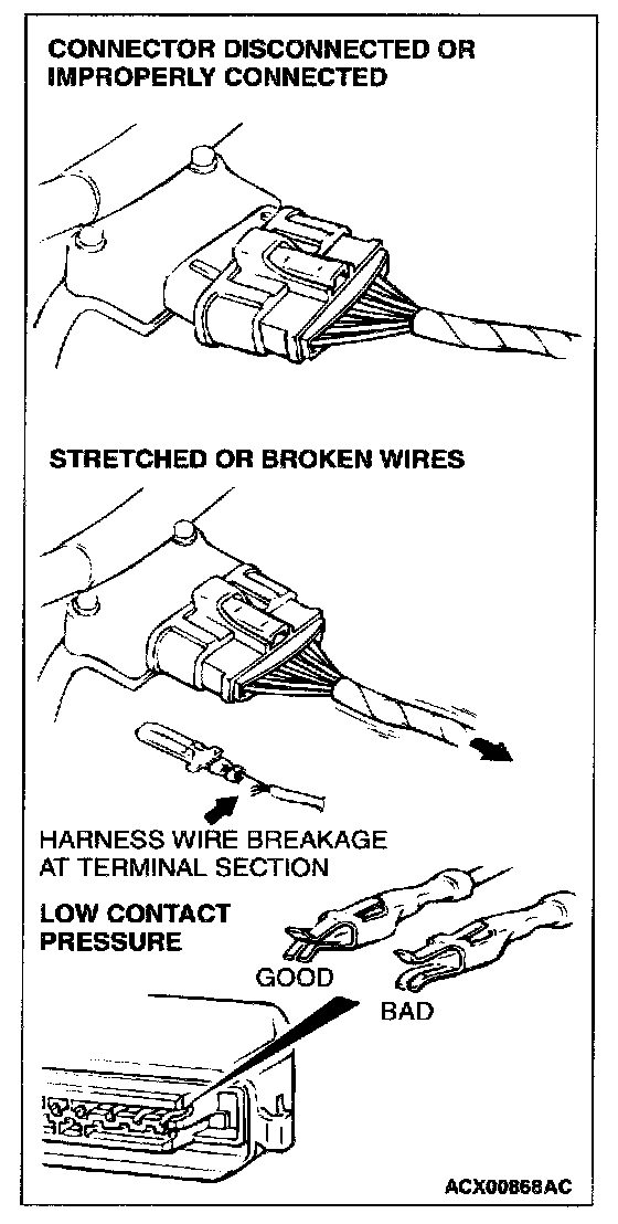 Use special tool, MB991219, to inspect the engagement of the male pins and female pins. [Pin drawing force: 1 N (0.2 pound) or more]