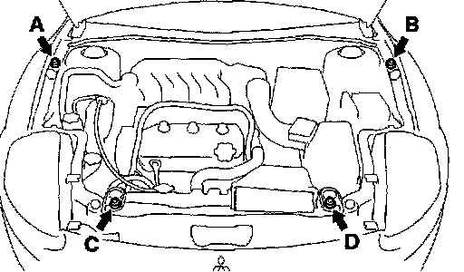 1) Set special tool MB991895 to the front fender mounting bolts (A and B) and the radiator support upper insulator mounting bolts (C and D), which are located in the engine compartment, as shown.