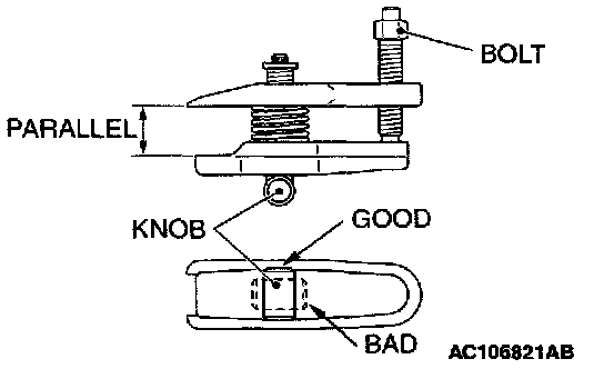 2. After turning the bolt and knob to adjust the insert arms of the special tool MB991897 in parallel, tighten the bolt by hand and confirm that the insert arms are parallel.