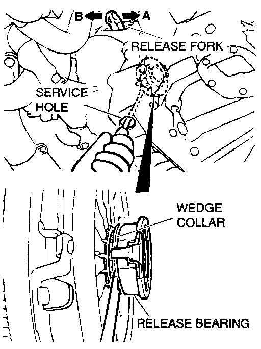 2. Insert a flat-tipped screwdriver into space between the release bearing and the wedge collar while pushing the release fork to the "A" direction by hand slightly
