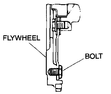 CAUTION: Do not remove the flywheel mounting bolt shown by the arrow. If this bolt is removed, the flywheel will become out of balance and damaged.