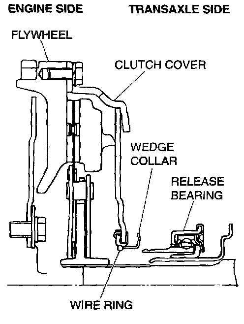 CAUTION: On the pull-type clutch, do not roll the transaxle assembly when installing it to the engine. If the transaxle assembly is rolled, the wedge collar and the wire ring will be deformed, causing a clutch malfunction due to improper engagement of the wedge collar and the wire ring.