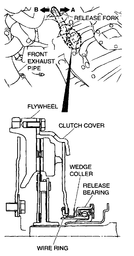 NOTE: If the release bearing is disengaged, the release fork will move fully to the "B" direction via the return spring.