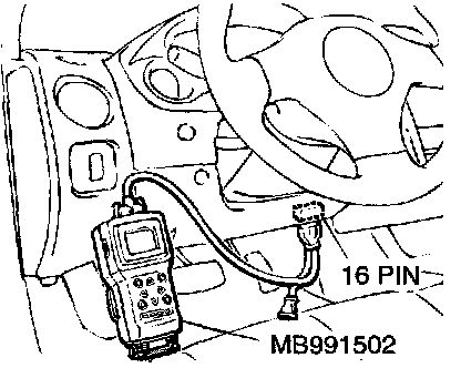 CAUTION: To prevent damage to scan tool MB991502, always turn the ignition switch to the "LOCK" (OFF) position before connecting or disconnecting scan tool MB991502.