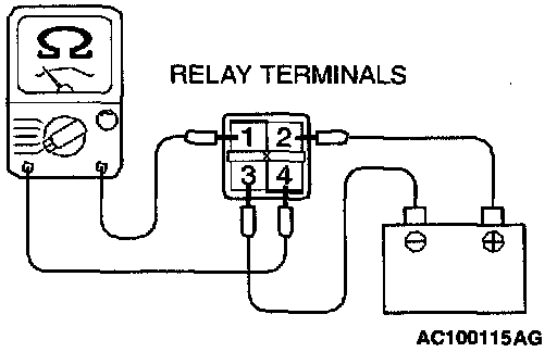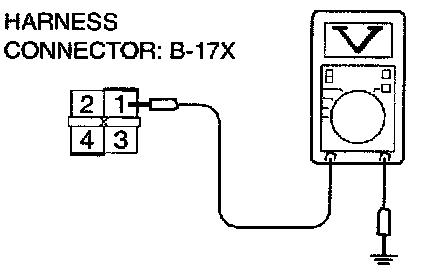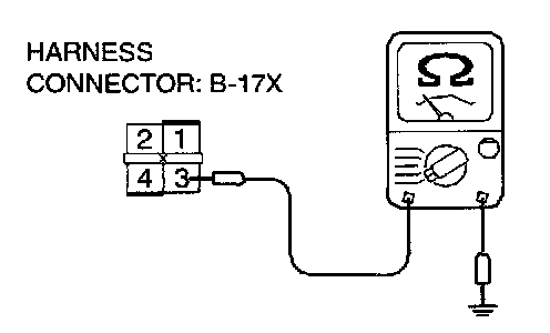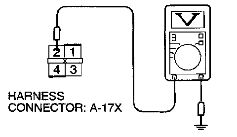 3) Measure the resistance between terminal 1 and 4 of A/T control relay connector A-17X. Should be less than 2 ohm when the jumper wire connected.