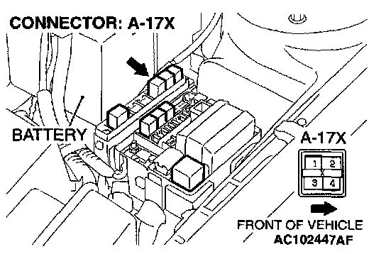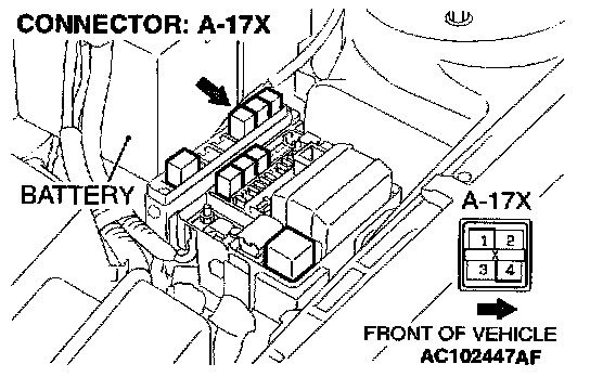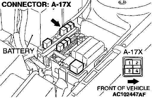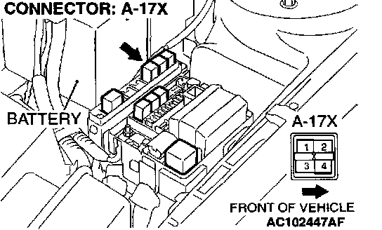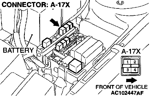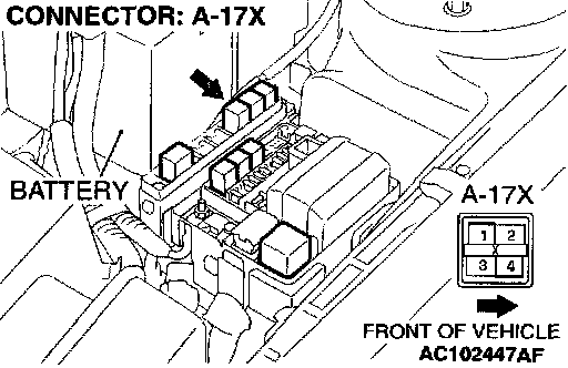 2) Use jumper wires to terminal 2 of A/T control relay connector A-17X to the positive battery terminal, and terminal number 3 of A/T control relay connector A-17X to the negative battery terminal.