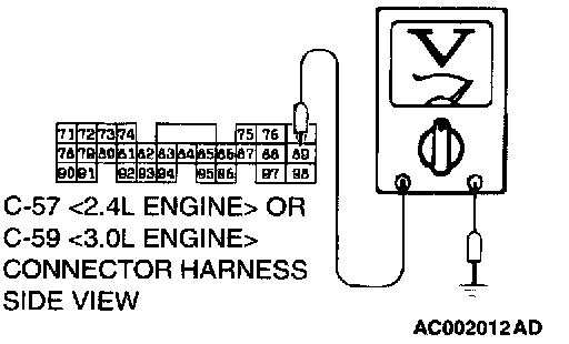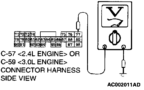 STEP 12. Check the relay output voltage at PCM connector C-57 <2.4L Engine> or C-59 <3.0L Engine> by backprobing.