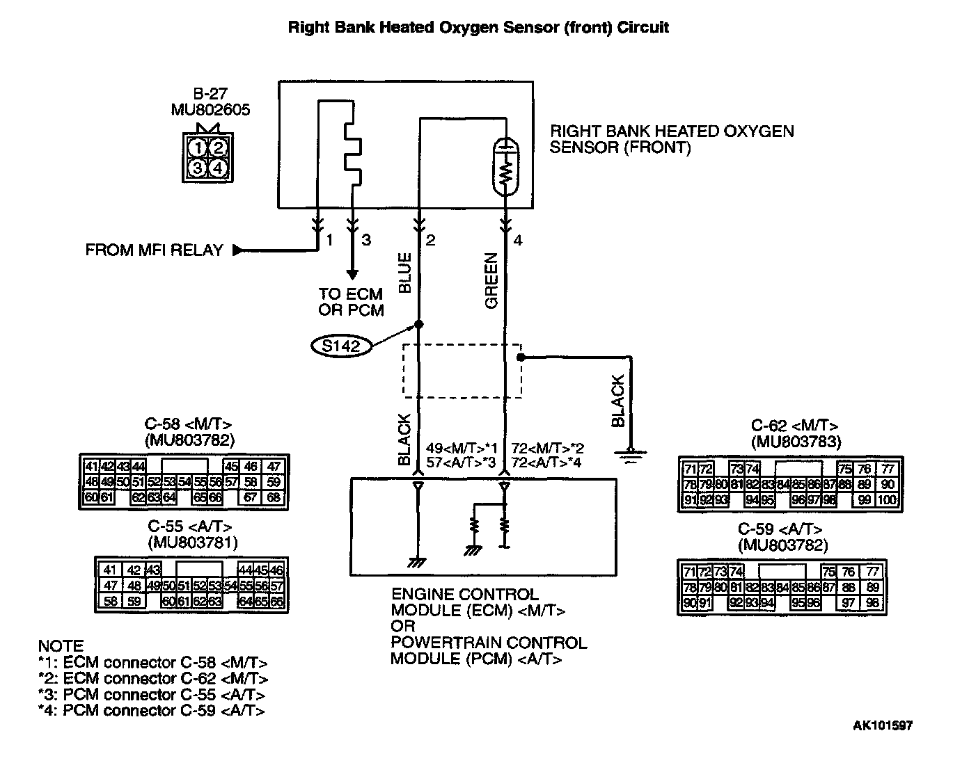 - Terminal 2 of the right bank heated oxygen sensor (front) is grounded with ECM (terminal 49)